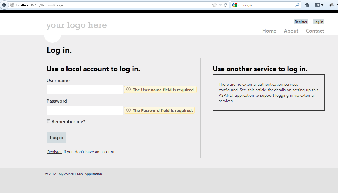 @model MvcApplication1.Models.LoginModel@{ ViewBag.Title = "Log in";}<script type="text/javascript"> $(document).ready(function () { var validator = $("#tickets").kendoValidator().data("kendoValidator"); $("input").click(function (e) { if (!validator.validate()) { e.preventDefault(); } }); });</script><hgroup class="title"> <h1>@ViewBag.Title.</h1></hgroup><section id="loginForm"><h2>Use a local account to log in.</h2><div id="tickets">@using (Html.BeginForm(new { ReturnUrl = ViewBag.ReturnUrl })){ @Html.AntiForgeryToken() @Html.ValidationSummary(true) <fieldset> <legend>Log in Form</legend> <ol> <li> @Html.LabelFor(m => m.UserName) @Html.TextBoxFor(m => m.UserName) @Html.ValidationMessageFor(m => m.UserName) </li> <li> @Html.LabelFor(m => m.Password) @Html.PasswordFor(m => m.Password) @Html.ValidationMessageFor(m => m.Password) </li> <li> @Html.CheckBoxFor(m => m.RememberMe) @Html.LabelFor(m => m.RememberMe, new { @class = "checkbox" }) </li> </ol> <input type="submit" value="Log in" /> </fieldset> <p> @Html.ActionLink("Register", "Register") if you don't have an account. </p>}</div></section><section class="social" id="socialLoginForm"> <h2>Use another service to log in.</h2> @Html.Action("ExternalLoginsList", new { ReturnUrl = ViewBag.ReturnUrl })</section>@section Scripts { @Scripts.Render("~/bundles/jqueryval")}Please check below screen shot.