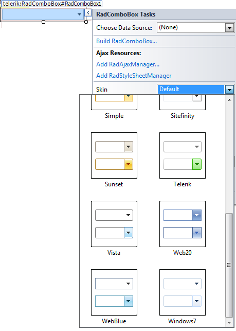 <%@ Page Language="vb" AutoEventWireup="false" CodeBehind="WebForm1.aspx.vb" Inherits="_2008Telerik.WebForm1" %><%@ Register Assembly="Telerik.Web.UI" Namespace="Telerik.Web.UI" TagPrefix="telerik" %><!DOCTYPE html PUBLIC "-//W3C//DTD XHTML 1.0 Transitional//EN" "http://www.w3.org/TR/xhtml1/DTD/xhtml1-transitional.dtd"><html xmlns="http://www.w3.org/1999/xhtml"><head runat="server"> <title></title></head><body> <form id="form1" runat="server"> <div> <telerik:RadScriptManager ID="RadScriptManager1" runat="server"> </telerik:RadScriptManager> <telerik:RadComboBox ID="RadComboBox1" AutoPostBack="true" Skin="Vista" runat="server"> </telerik:RadComboBox> <telerik:RadComboBox ID="RadComboBox2" runat="server"> </telerik:RadComboBox> </div> </form></body></html>Thank you