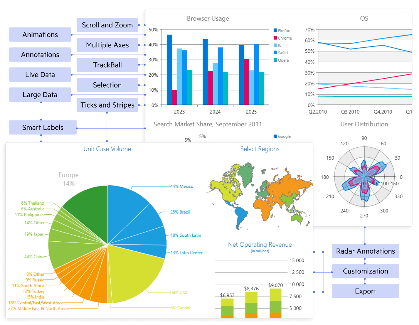 • 20+ chart types: line/area, bar/column, pie/donut, scatter/bubble, financial, polar