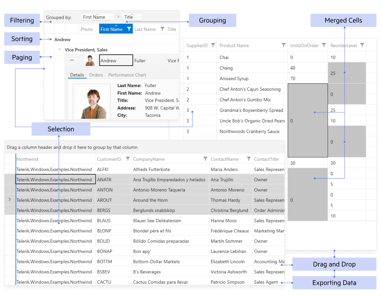 Handle heavy data with an industry-leading Data Grid: filtering, grouping, sorting, summaries, hierarchy and 100+ pro features. Create, read and export text, spreadsheet and PDF with built-in Document Processing with no external dependencies.