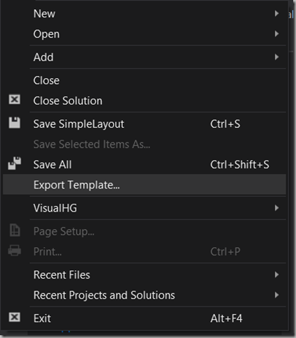 The first step is to create your project in Visual Studio.  If you would like to use the project that I built in my last post, you can download it here. Once you have created your project, select “Export Template…” from the File menu (shown in Figure 1).