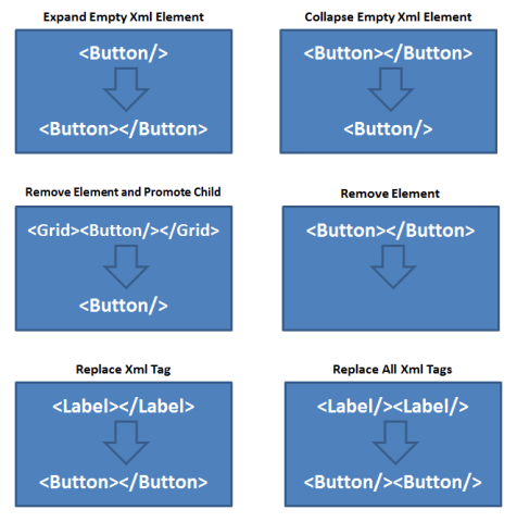 Many new XML/XAML refactorings have been introduced and are accessible from the visual aid. Expand Empty Xml Element takes a collapsed tag, such as <Button/>, and expands it to <Button></Button>. Conversely, Collapse Empty Xml Element does the opposite by going from <Button></Button> to <Button/>. If you need to remove an outer element, Remove Element and Promote Child will ensure the child elements are kept intact. If the element had no value or children, the Remove Element refactoring deletes it instead. Finally, Replace Xml Tag and Replace All Xml Tags is useful for renaming elements.