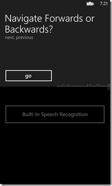 While this is great for some applications, others may like a less intrusive way of obtaining speech data from the user. This is where Telerik RadControls for Windows Phone 8 comes in. No GUI is required and you can declare voice commands declaratively through XAML instead of code-behind. The example shown above was created through code-behind listed below.