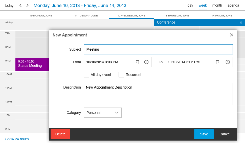 • Scheduler: Our scheduler provides the mechanism to overflow its View selection options into a dropdown on small screen estates. Additionally, it can apply short date/month/year abbreviations where applicable. Thus, its visual presentation is fine-tuned for usage in responsive web scenarios.