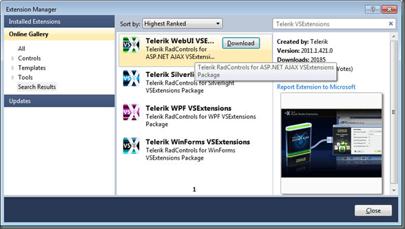 It is important to note here that the VSIX packages of the Telerik VSExtensions for Visual Studio 2010 are equally the same: we get the packages and upload them to the Visual Studio Online Gallery after the build. The difference is only in the execution of the VSIXInstaller (the tool, responsible for the unpacking of a VSIX package).