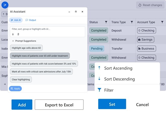 The Telerik UI for Blazor Data Grid smart AI features let users drive complex data operations with natural‑language prompts, enabling filtering, multi‑column sorting, grouping, highlights, column show/hide and reordering, pagination, selection, and even data export.