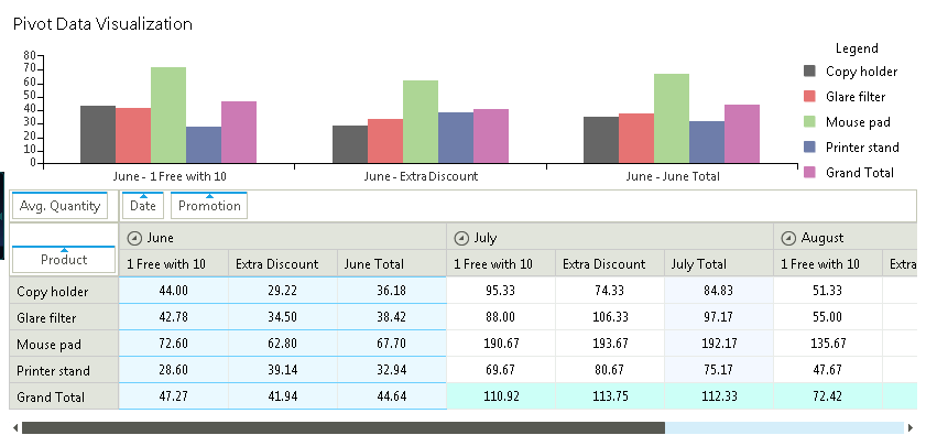 Getting lost in numbers and the totals does not help much? Native integration with RadChartView will allow the end-user to visualize graphically each selection made in RadPivotGrid, thus easily exploring hidden trends in the data and unveiling critical business insights using charts: