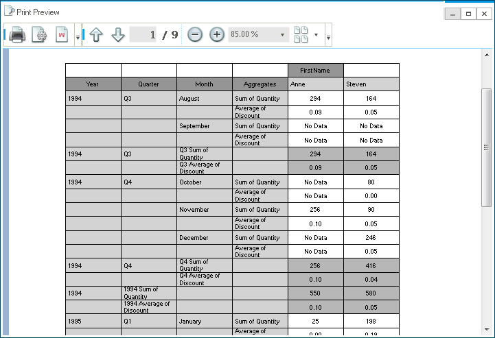 Printing is yet another critical feature for every data management control. Printing for RadPivotGrid exposes the same well-known common functionality available to RadGridView and RadScheduler – setting paper size, watermark, etc. The end-user can also set Pivot-specific printing properties such as font and color to the group descriptions and aggregates. Thanks to the PrintElementFormatting and PrintElementPaint events you can put a custom touch to the way the data cells will be printed out. Here is how you can easily trigger the Print Preview dialog: