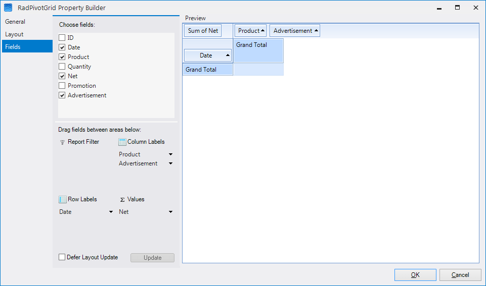 To start RadPivotGrid off on your application, you should first set it up. Doing that from a lengthy list of properties would waste your time. In order to save you time and efforts, we decided that such a complex control should be supported by a powerful designer that allows for easy setup and customization. Meet our Property Builder: