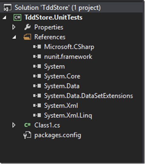 This is a simple case and gives us a good place to start. As this is the first requirement and first test, I have no code or even a Visual Studio solution. To get started I’m going to create a blank Visual Studio solution for my project, which will call TddStore. Next I’ll create a class library for my unit tests called TddStore.UnitTests and I’ll use NuGet to add a reference to NUnit to my unit test library. If you need a refresher on how to do any of these tasks you can check out the post for Day Two. After completing these steps my Solution Explorer should look something like Figure 1: