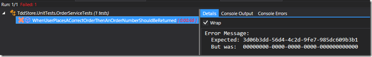 At this point I want to run my tests again. The test should be failing because while I’ve supplied all the needed dependencies that have enabled me to write the code that should make the test pass, I’m still not getting back the value for order id that I expected (Figure 2)