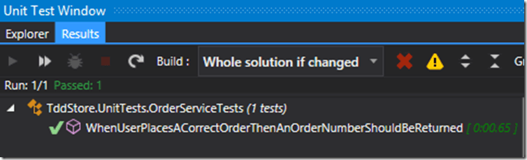 Finally I’m telling my mock that if a call is made to my mock or OrderDataService and it matches the criteria defined in my Arrange expression I want it to return a specific value, in this case the expectedOrderId. And that’s it; with one line of code I have elevated my Dummy mock object to a Stub. If I run my test now I can see that it passes and I have fulfilled my current test case (Figure 3)