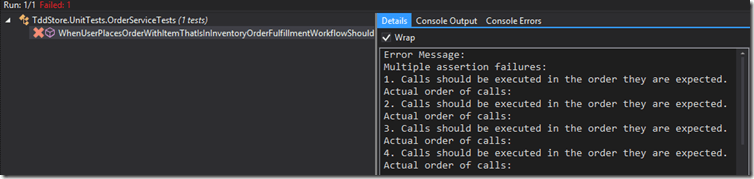 Our test failed as none of the methods on our OrderFulfillmentService were called. The next step is to implement the code needed for this test: