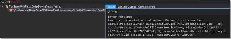 32: Mock.Assert(_orderFulfillmentService); 33: } In the above code, starting on line 14 and continuing through line 26 I am arranging the mock for my OrderFulfillmentService. Don’t worry or get distracted by the parameter lists for the mocks; we’ll deal with making those a little more specific in a future post. For now we’re focusing on the order of the methods. You’ll notice that I’ve arranged these mocks in the order I want the methods to be called; OpenSession –> IsInInventory –> PlaceOrder –> CloseSession. If I attempt to call these in any other order, my test will fail when I call MockAssert (line 32).