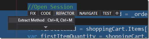 What I see is a large “dealing with the order fulfillment service” process that I want to excise from the PlaceOrder method. Once that’s done I will have one method to call that starts the entire process. This protects me from changes to the individual steps involved in working with the order fulfillment service. So the first step is to extract ALL of the code that deals with the order fulfillment service to a separate private method. Since I’m using JustCode this is easy; I can highlight the hole block of code, and either select “Extract Method” from the JustCode Visual Aid menu (CTRL + `) (figure one) or use the keyboard shortcut (CTRL + R, CTRL + M) and JustCode will extract the code to a new private method.