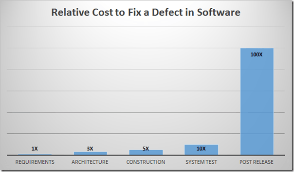 The earlier a defect is found the less expensive it is to repair. To keep the math simple, let’s say that the base cost to fix a defect is $100. When a defect is found during the Requirements phase it costs a very manageable $100 to fix. If the defect is found in Construction phase it costs $500, which not a good as $100 is still manageable. In System Test the same defect now costs $1,000. This starts to become a little harder to accept, especially if you are working on a smaller project that has a budget of under $100,000. If the defect is found after the application is release that amount balloons up to $10,000. That number represents money paid to testers, developers, designers, business analysts and whoever is designated to be in charge of deployment. That number does not take into account intangibles like lost sales, angry customers, employee morale, violated SLAs and any fallout from potential security failures.