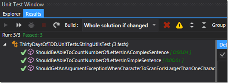 21: } Instead of wrapping the whole method in a try/catch block I am checking the length of the characterToScanFor parameter. If the length is not one I am throwing an AgurmentException exception. This is a much better approach and I’m actively checking a validation rule as opposed to just throwing an error to satisfy a requirement (“Works by Coincidence” is a code smell that will be covered in a future post). This also prevents me from swallowing a defect that is not related to my validation rule. All in all this is a much better approach. But does it work? The only way to know is to run the tests (Figure 1):