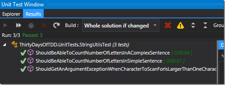 31: 32: _stringUtils.FindNumberOfOccurences(sentenceToScan, characterToScanFor); 33: } Running our tests demonstrates that they still pass after this change (Figure 1):