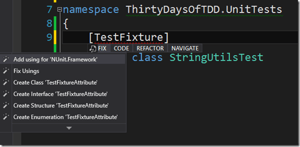 JustCode can easily add any missing usings for me. I’ll select the “Add using for ‘NUnit.Framework’” menu item and JustCode will add a using statement for the NUnit.Framework namespace for me (line 3):