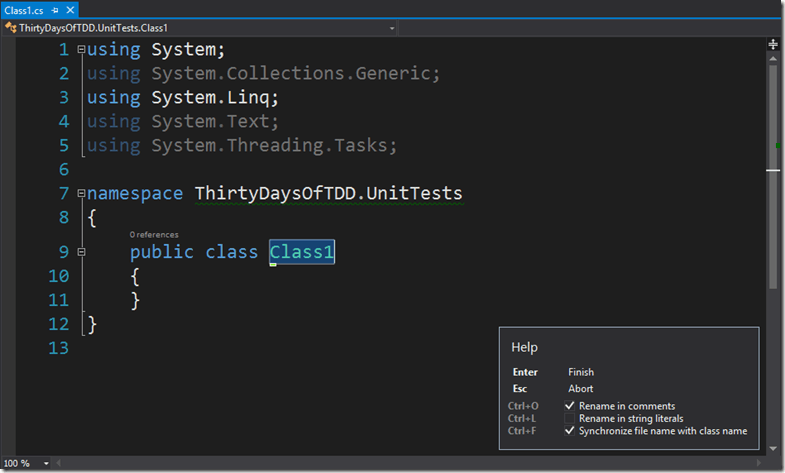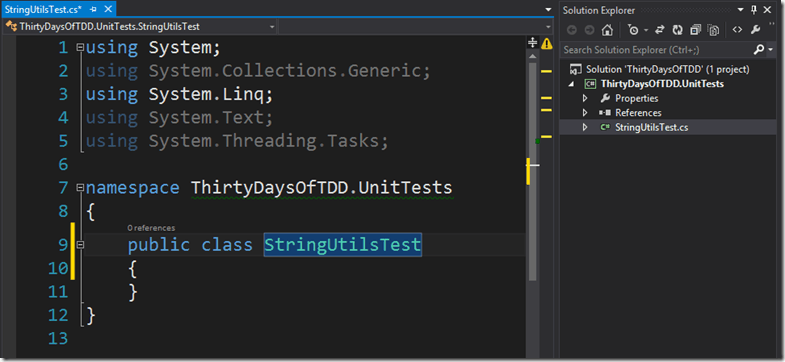 Since Visual Studio was thoughtful enough to provide us with a starter class (Class1) we’ll go ahead and use it, but first I want to rename it. I’ve decided that for this requirement I’m going to create a class for the method called “StringUtils.” In your company or project you no doubt have some sort of naming standards or policy describing where functionality is implemented based on what it does (even if it’s not formal), and you should try to adhere to these local standards at all times. But for this demo, calling the class StringUtils is good enough, so that’s what I’m going to do. Based on this, I’m going to rename Class1 to StringUtilsTests. The current code looks like this: