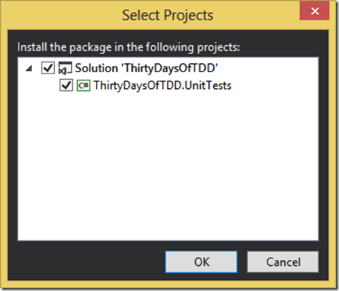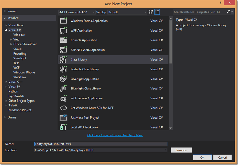 To create a project for my unit tests, I right-click the ThirtyDaysOfTDD solution in the Solution Explorer and Add –> New Project… When I do this I’m presented with the “Add New Project” window shown in Figure 3: