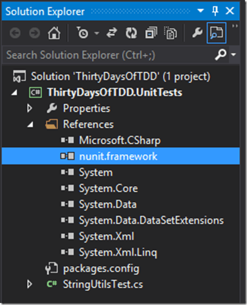 As you can see above, I’ve selected a C# Class Library and named it “ThirtyDaysOfTDD.UnitTests”. I left the default Location. I click the OK button and my project is created, as you can now see in the Solution Explorer in Figure 4: