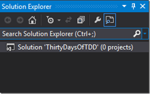 Select the Blank Solution, specify a name (I’m using ThirtyDaysOfTDD, but you don’t have to) and make sure the Location is correct. When all of that is done press OK and you should have a Visual Studio solution with nothing in it, as shown in the Solution Explorer (Figure 2)