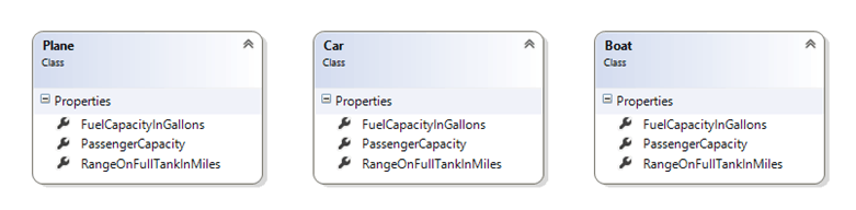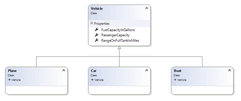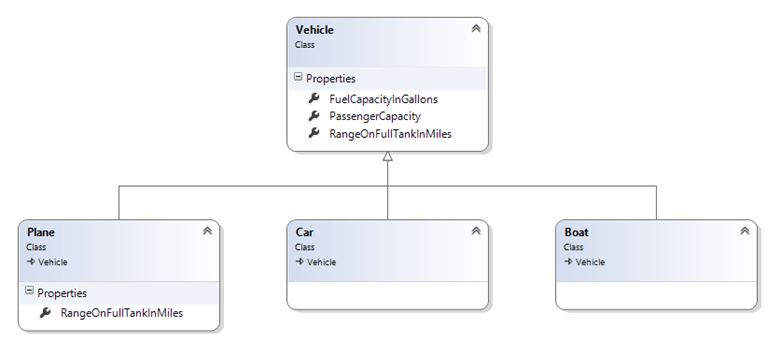 Now the Plane, Car and Boat classes can inherit the functionality for the three properties (FuelCapacityInGallons, PassengerCapacity and RangeOnFullTankInMiles) from the base class Vehicle. If the functionality provided by Vehicle is sufficient for each particular derived class (the classes that inherit from the Vehicle base class) than the developer does not have to do any thing else. However if a derived class needed a different type of functionality for one of the properties defined in the base class, they can easily override the functionality from the parent and provider their own as shown in Figure 3: