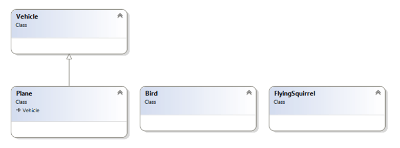 Looking at the three classes in the bottom row (Plane, Bird and FlyingSquirrel) it’s pretty obvious that these are all things that fly, but they do so in very different ways. These classes share one behavior, but not much else. Two of them are animals, one is not. Two of these move by self-powered flight, the other one glides. Trying to shoehorn these three object into the same class hierarchy would be a mistake. It would be VERY difficult to find an abstraction where that would make sense.