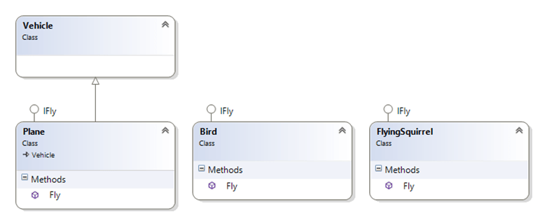 To apply this to the current problem at hand, I can create an interface called IFly with a method called Fly. The next step is to have Plane, Bird and FlyingSquirrel implement the IFly interface as shown in Figure 5: