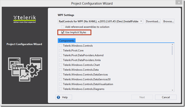 Figure 1: Project Configuration Wizard in a new RadControls for WPF or Silverlight selecting Implicit Styles.