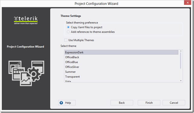 If you select the option, “Add references to theme assemblies”, a dll containing the theme will be included in your project. Since you will not be editing the styles directly through XAML files (with the previous option), it will make upgrading your project easier. If you would like further info on this topic, it can be found in our help documentation.