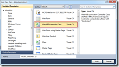 In the Add New Item dialog, select Web API controller, give the controller a name, and click Add.