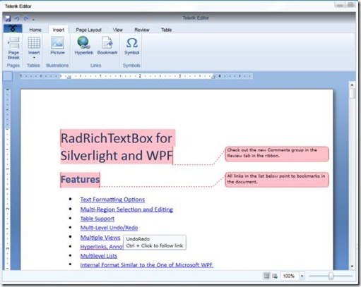 The latest release – Q1 2011 brought some great enhancements to the Silverlight RadRichTextBox and its new WPF counterpart. The newly introduced functionality spans from capabilities for editing rich text – multilevel lists and extended table support, to additional formatting options – incorporating annotations in the document with hyperlinks that navigate to them, and inserting comments at different positions in the document. The customization and extensibility, which the RichTextBox takes pride in, have also made a step forward with its - as of now - localizable UI and the possibilities to overwrite the existing key-bindings used for triggering commands. In addition, the list of supported import/export formats has been expanded to include RTF, thus providing for one more option to persist your rich documents. Last but not least, the design-time support has been boosted by a wizard that appears when you drop the rich text box on the designer surface in Visual Studio and guides you through the initial configuration of the control.