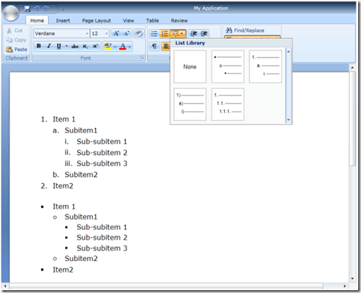 One of the most requested enhancements is multilevel bulleted and numbered lists. Changing the level of any list item can be done at any time with the Increase-Indent and Decrease-Indent buttons on the Home tab of the ribbon bar or by the key-bindings Tab and Shift+Tab respectively. There are default predefined list-styles and others, available as a gallery in the ribbon bar, or you can register and utilize custom ones through the API. What is more, preserving the list styles in documents, created by other programs, like MS Word, is also supported.