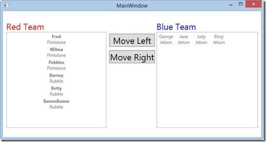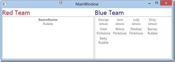 The first ListBox is for the RedTeam. It will bind to the Flintstones collection. Notice the property AllowDrop is set to True,