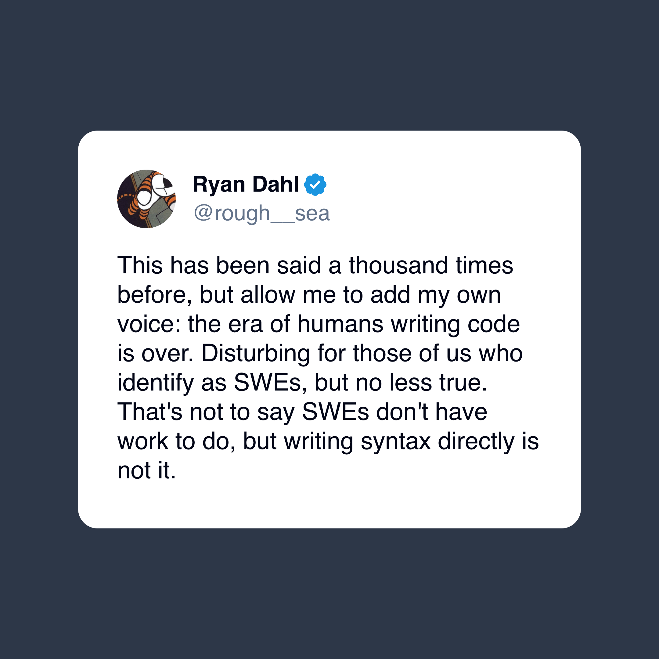 Ryan Dahl, the creator of Node.js and Deno, aptly put it in a recent social media post: “This has been said a thousand times before, but allow me to add my own voice: the era of humans writing code is over. Disturbing for those of us who identify as SWEs, but no less true. That’s not to say SWEs don’t have work to do, but writing syntax directly is not it.”
