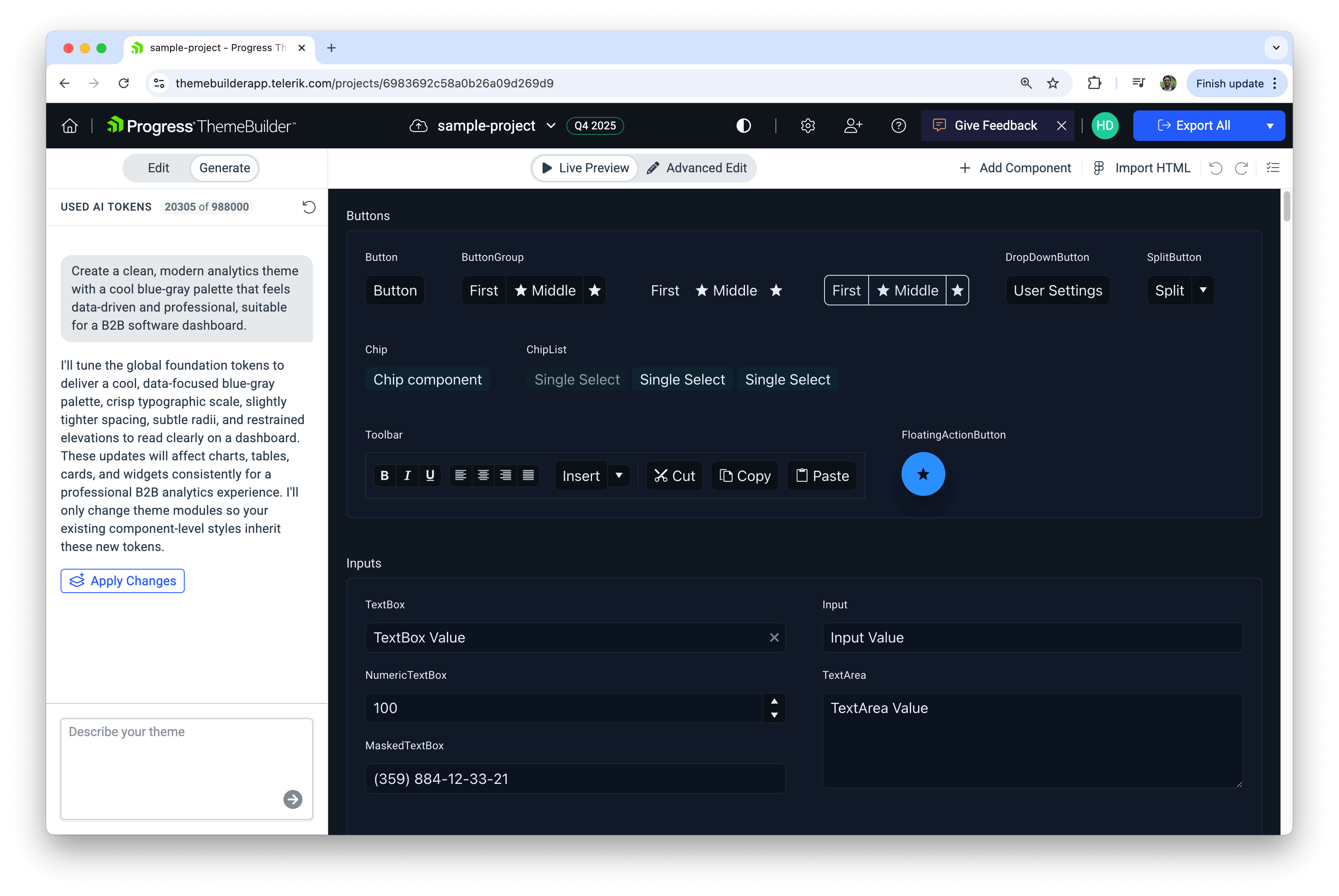 Progress ThemeBuilder has taken this a step further with AI-powered theme generation. Instead of manually configuring dozens of color variables and spacing values, we can describe the aesthetic we’re going for in plain English: “Create a clean, modern analytics theme with a cool blue-gray palette that feels data-driven and professional, suitable for a B2B software dashboard.” The AI generates a complete design system that applies consistently across all our components.