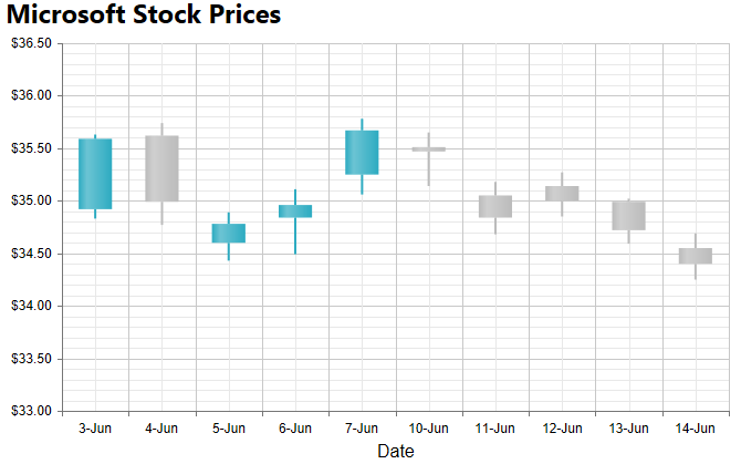 With this release, we introduced the Candlestick chart type. I showed a sample chart that I was able to build from the most recent two weeks of Microsoft stock positions. These values were fetched from a SQL Compact database and painted with a simple function that added the data points to a Candlestick series. With very little code, and a few format strings, I showed the attached chart.