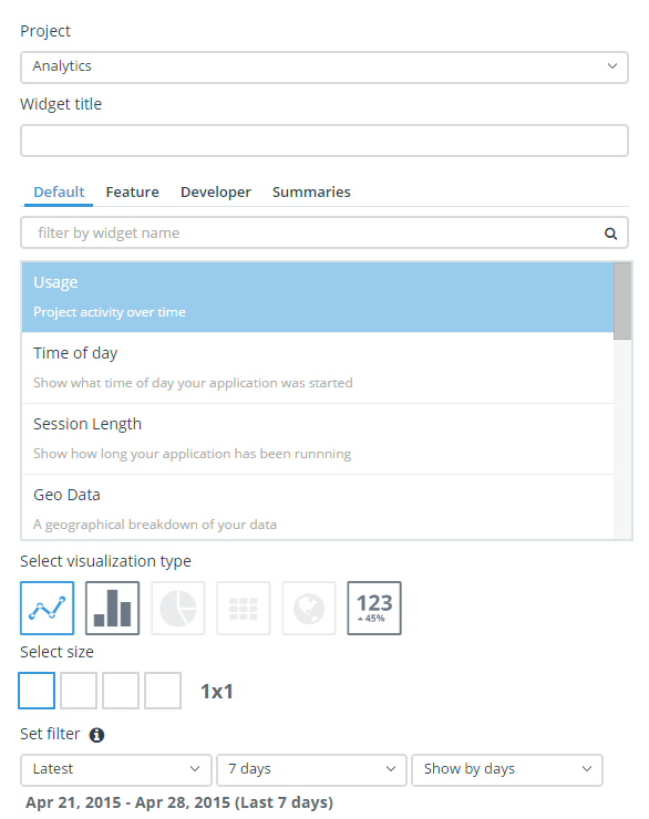 First select the application you want metrics from in the Projects dropdown. The list below will then be populated with the available items. Select the metric you want and chose how you want it visualized.