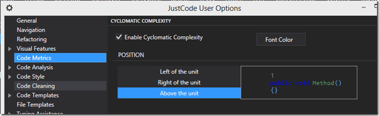 JustCode will analyze your code and show you the CC number near the top of your method. You can enable this in the JustCode Options Dialog (JustCode –> Options… –> Code Metrics) (Figure 1):