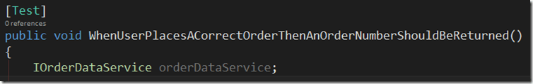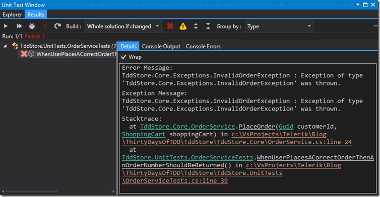 In the details pane, after the “Error Message” section you can see the stack trace. Just by looking you can probably see that every class name, method name and file location is clickable. Clicking these takes me to the definition or location indicated. If I click on TddStore.Core.OrderService, it takes me to the definition of the OrderService class. If I click on the PlaceOrder method it takes me to the top of the PlaceOrder method. If I click on one of the file locations, it takes me to that specific location. For example, if I click that last item in the stack, which points to line 39 in the OrderServiceTests.cs file, it takes me to that line in that file (Figure 6:)