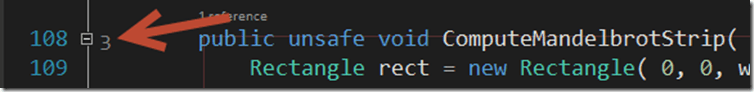 To start having JustCode display the CC for your code simply check the “Enable Cyclomatic Complexity” checkbox. I also have the ability to decide where the indicator will be shown in Visual Studio. I can also get a preview giving me an idea of how the CC metric will look, making it easier for me to decide where I want the metric to go. If I select “Left of the unit” and click “Save” I can see the CC number next to my method declaration (Figure 2):
