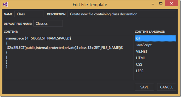 In this example I’m creating a C# class. The content language is set to C#, which prevents this template from being used somewhere that would not be appropriate, like a VB.NET project.