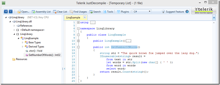 19: } 20: } 21: } I compiled this into an assembly and loaded it into JustDecompile. In JustDecompile I navigated to the GetNumberOfWords method I can see that my LINQ query was decompiled with very few changes and is easily understandable (Figure 1)