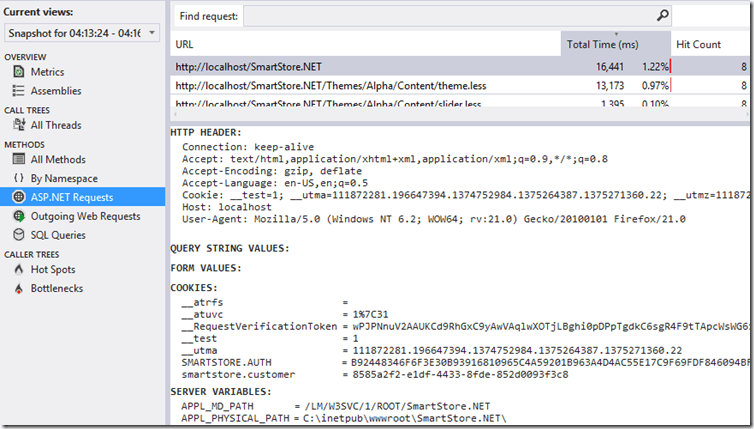 If I need to see the details of the request, I can click on the ASP.NET Requests section of the Methods group and see the detailed information for the HTTP Request (Figure 7):