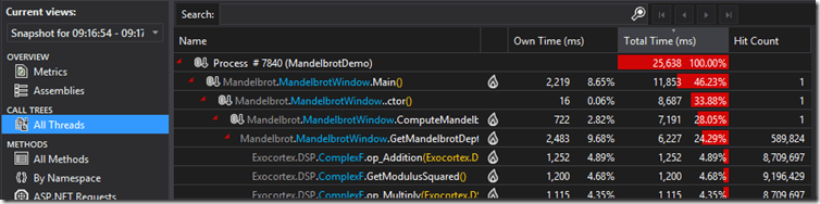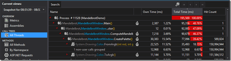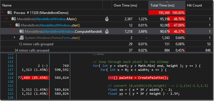As I can see here, my call to MandelbrotWindow.CreatePalette is taking a high percentage of my applications time (39.42%). Looking at this I think it’s safe to say that my problem is probably somewhere in that method. With source level profiling, I can drill down into my code and see exactly, to the line of code, where my problem is (Figure 2):