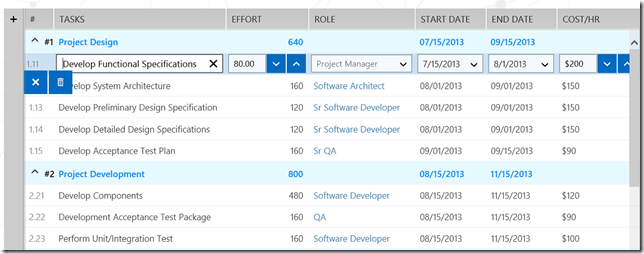 We’ve continued to enhance our flagship Enterprise control, the RadGrid, by adding editing capabilities.  Optimized for touch and fully supporting keyboard and mouse actions as well, your users can insert, update and delete their data right in the RadDataGrid itself. In place editing of data in the RadDataGrid is built into the control, so you don’t need to do any complicated event handling or UI manipulation to give your users an excellent experience right out of the box.  Additionally, the RadDataGrid has a rich API for programmatic manipulation. You users can update cell values, delete rows, insert new rows and handle any CRUD operation.  Figure 5 shows in place editing of a data row.