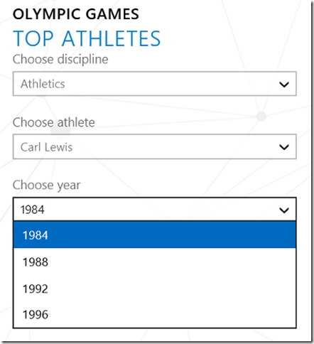 With the new Cascading feature you can easily implement cascading drop-down controls, where the selection in one drop-down will limit the available options in the others.  The example in Figure 9 shows cascading DropDownList boxes that continually narrow the selection of athletes for the user.