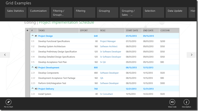 With the Q2 Beta release we’re launching brand new versions of our demo applications that will be available in the Windows Store. All of the source code for the Sample Demos is also installed locally when you install the RadControls for Windows 8 HTML. The UI and the overall experience have been significantly improved to enable you to easily learn and navigate through all the features and controls that are included in the RadControls for Windows 8 bundle.  The application was written with the full time involvement of our designers in order to set a new high standard for Windows 8 modern apps.